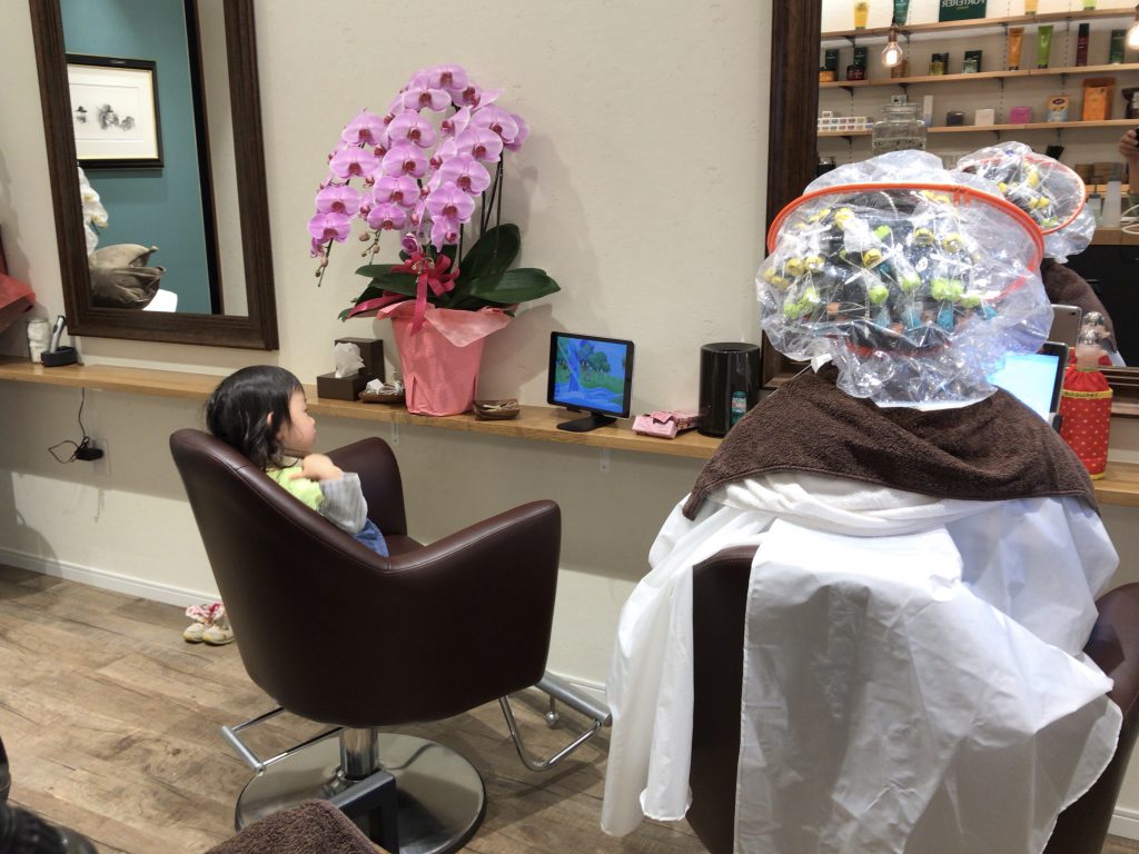 パーマがしっかりと長持ちするように、たくさん巻いたので時間がかかってしまったけど、ママと一緒に待ててえらい