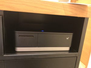 この1台にレジとレシートプリンターが一体になっていて、Bluetoothで無線接続し、iPadがディスプレイになるのです