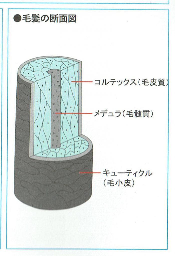 髪の断面図を見ると、メデュラという芯があり、コルテックスが入っていて、キューティクルというウロコがフタをしているのです