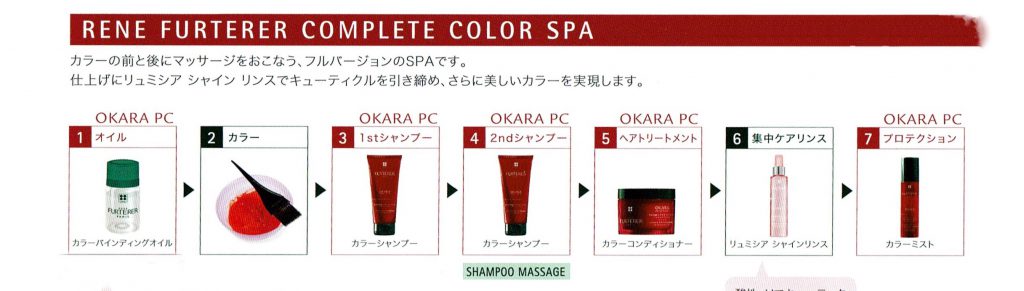 1.オイル→2.ヘアカラー→3.4.マッサージスパシャンプー→5.ヘアマスク→6.ケアリンス→7.洗い流さないトリートメント