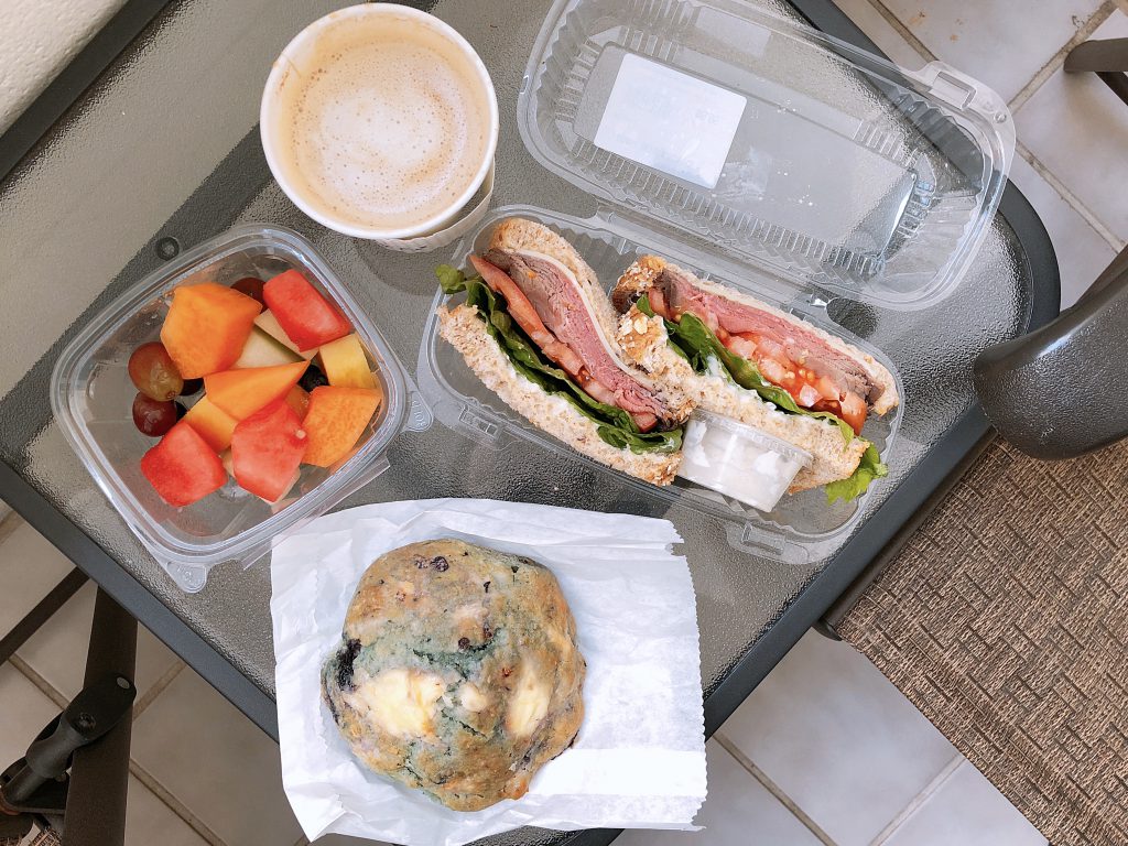 今朝はダイヤモンドヘッドマーケットグリルで、誰しもとりこになるブルーベリーチーズスコーンとローストビーフサンド、フルーツをGET!