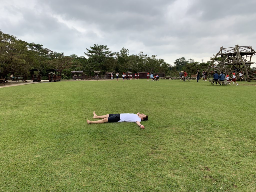 なので、芝生で寝転んで、放電中…