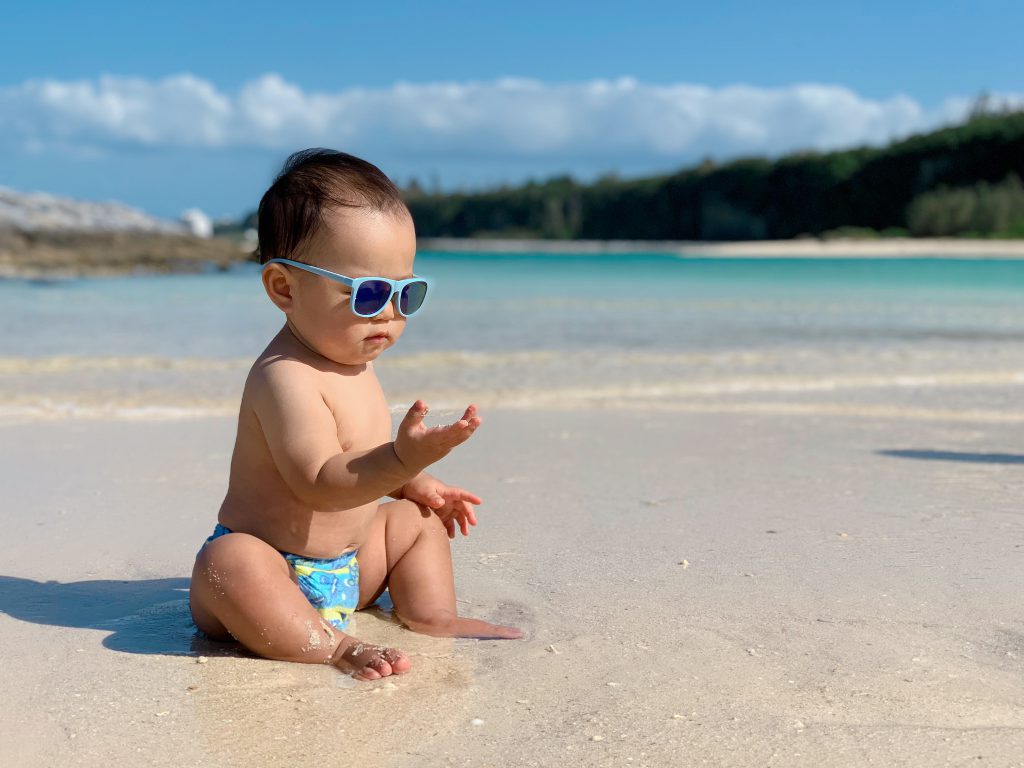 前回は波打ち際でギャン泣きだったけど、今回は不思議そうに砂遊びしていました
