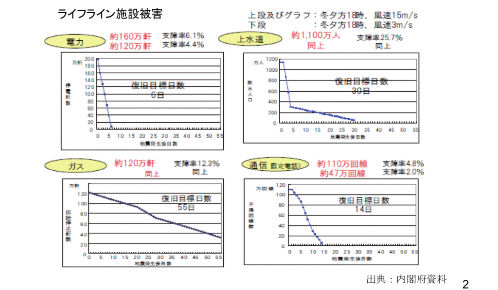 内閣府による首都直下型地震のライフライン復旧目標は以下のとおり(http://www.bousai.go.jp/kaigirep/kentokai/syutohukkou/pdf/sankoshiryo_2.pdf)