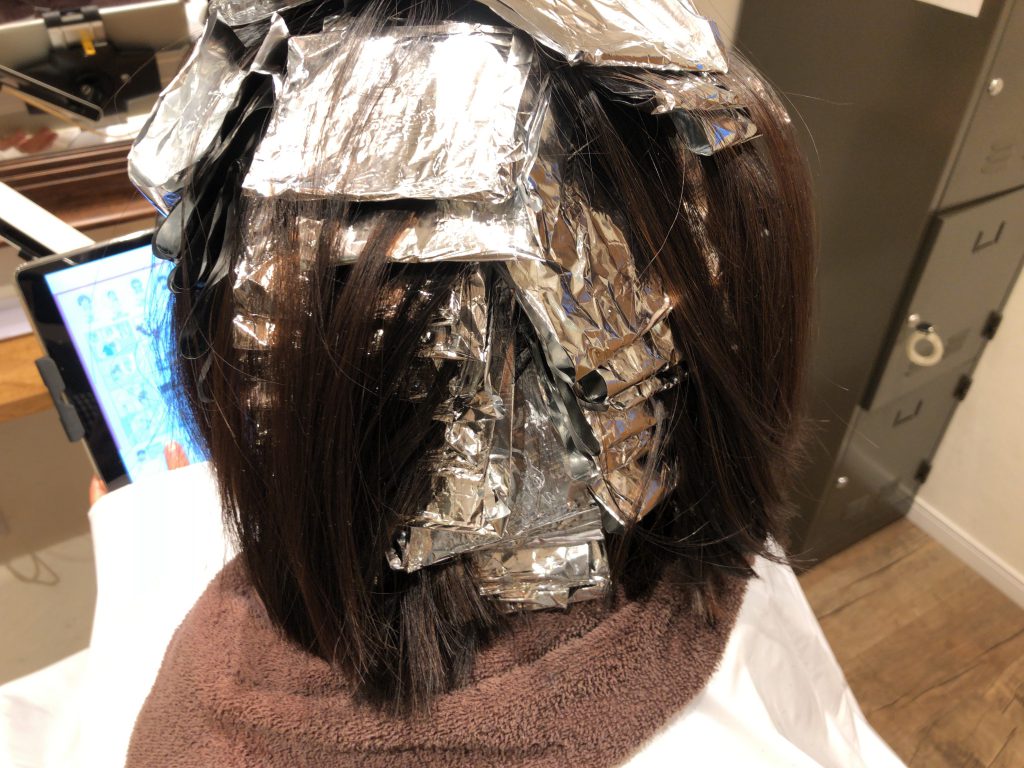 全体にきめ細かく毛束を作りたいので、2人前のホイルを入れます